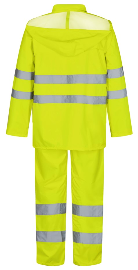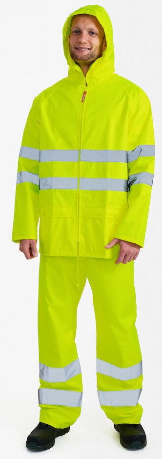 Lightweight and practical rain set consisting of a jacket and trousers. The jacket has a zipper at the front. Two front pockets. Adjustable hood that can be rolled up when not in use. Adjustable waistband and cuffs. The trousers have an elasticated waist. Access to the pockets. Adjustable at the bottom of the trouser legs. Reflective strips around sleeves, waistband and legs. Taped seams. Clothing class 3 (jacket). Clothing class 2 (trousers).