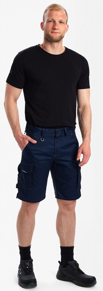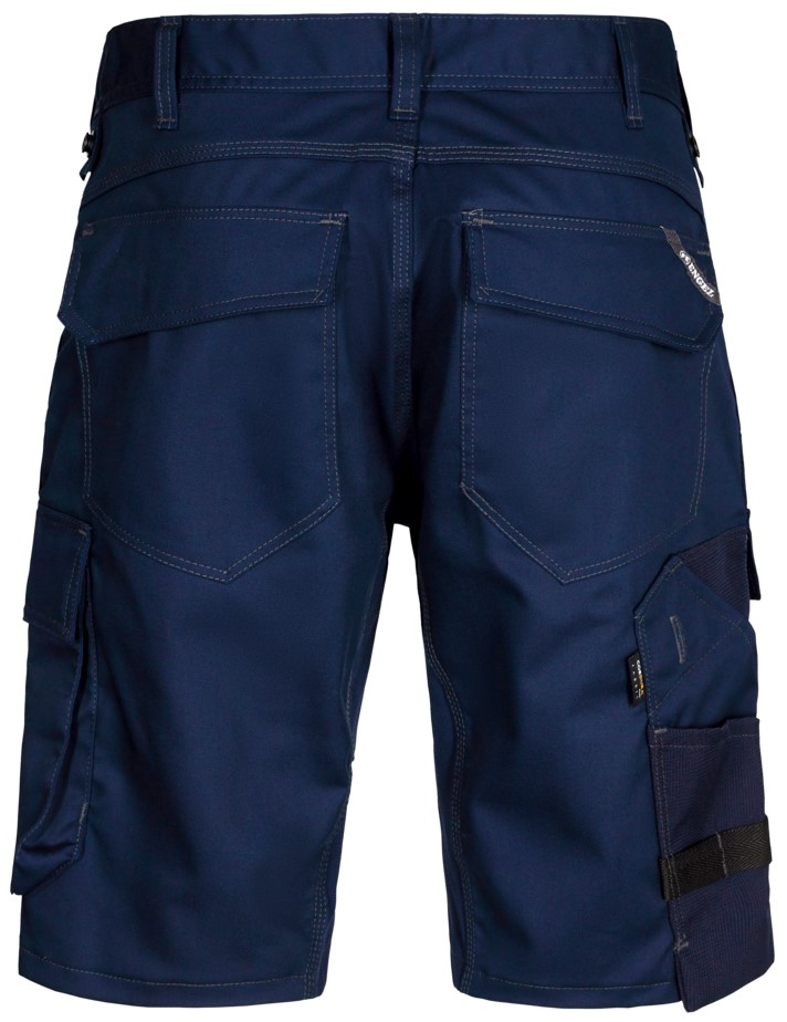 Functional craftsman shorts made of stretch with a slim fit and many practical details. Inserts made of extremely elastic, breathable stretch material in the inseam panel ensure even more comfort. D-ring at the front, e.g. for an ID card. Two back pockets. Cell phone pocket with flap on the right thigh. Left thigh pocket with flap. The thigh pocket has an additional zippered compartment. Reinforced folding rule pocket with additional compartments and tool loops. Thigh pocket and ruler pocket with free-hanging bottom ensure optimum freedom of movement. Modern holster pockets (9360-307) can be attached. Features: Material: 65% polyester / 35% cotton, 250 g/m² OEKO-TEX STANDARD 100 mechanical stretch modern fit breathable material for greater comfort many functional pockets reinforced folding rule pocket loop with D-ring Buttons for easy attachment of holster pockets (9360-307) Available in 5 colors Sizes: 42-66