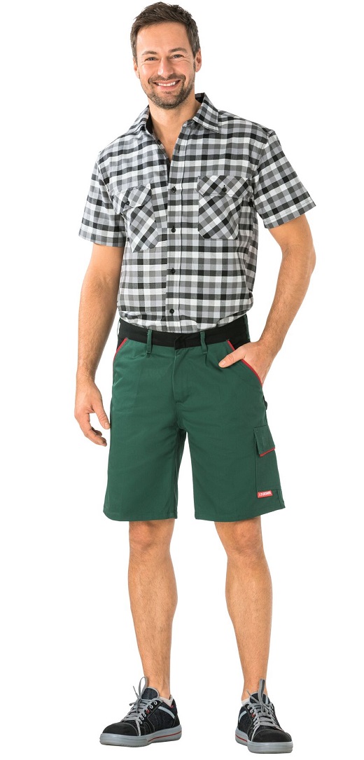 2 set-in pouch pockets, double ruler pocket, left thigh pocket with flap and Velcro fastener, mobile phone pocket, elastic waistband, 2 back pockets with flaps, zipper in trouser fly, pocket openings and pocket flaps with colored piping set off.