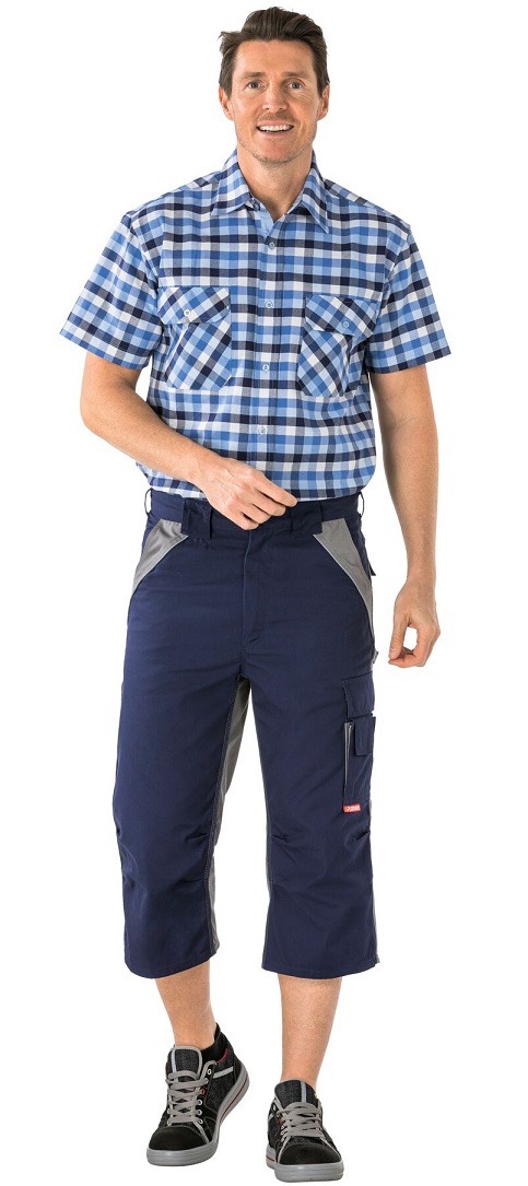 2 set-in pouch pockets, double ruler pocket on the right, thigh pocket on the left with flap and Velcro fastener, mobile phone pocket on the left, elasticated waistband, 2 hip pockets with flap and Velcro fastener, zip in trouser fly, reflective piping as safety equipment.