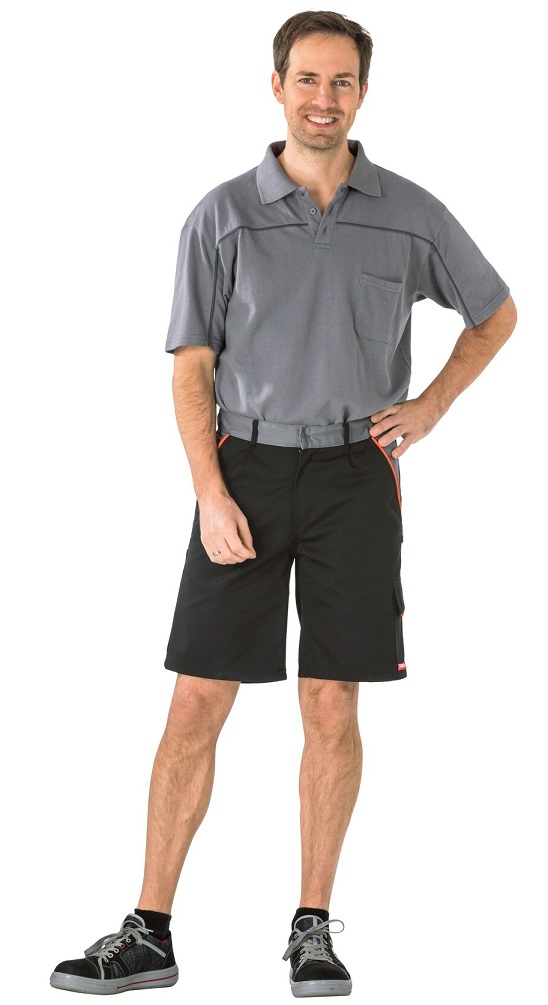 2 set-in pouch pockets, double ruler pocket, left thigh pocket with flap and Velcro fastener, mobile phone pocket, elastic waistband, 2 hip pockets with flaps, zip in trouser fly, pocket openings and pocket flaps with coloured piping.