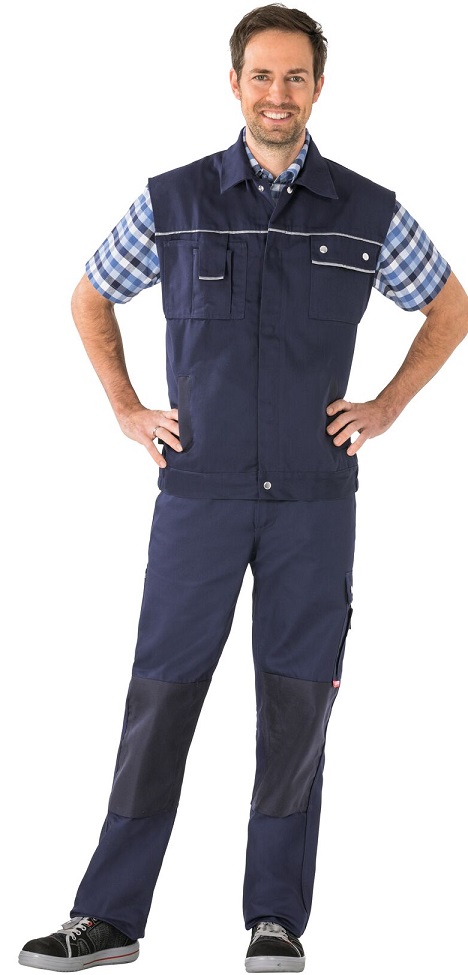 2 set-in Cordura® pouch pockets, reflective piping on shoulder saddle and pocket flaps, 2 breast pockets, left with flap and press studs, right with additional mobile phone pocket, elasticated waistband, concealed press stud front closure, hanger in collar.