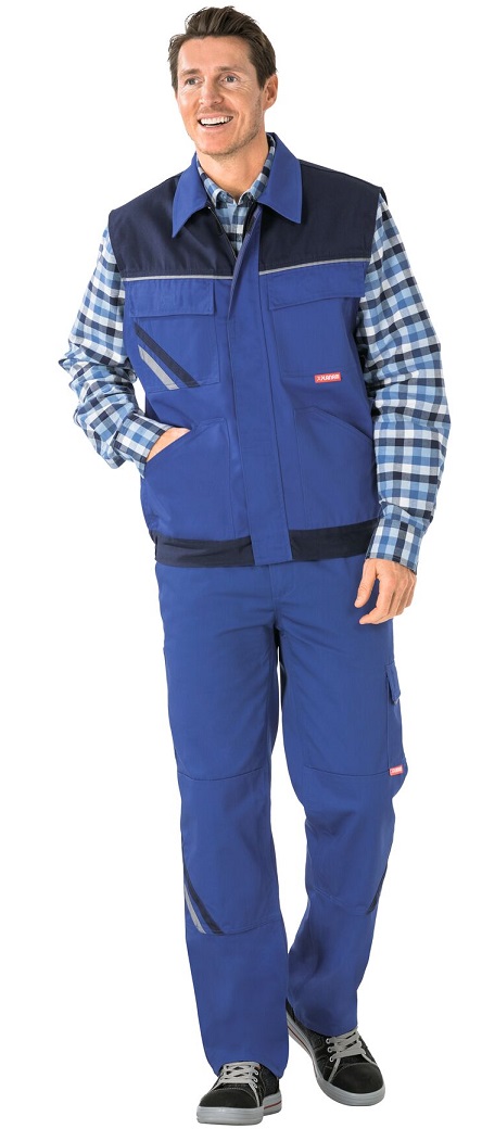 2 patch side pockets, 2 breast pockets with flap and Velcro, color applications on the right breast pocket, elastic waistband, concealed front zipper, piping on the saddle, 2 golf pleats in the back.