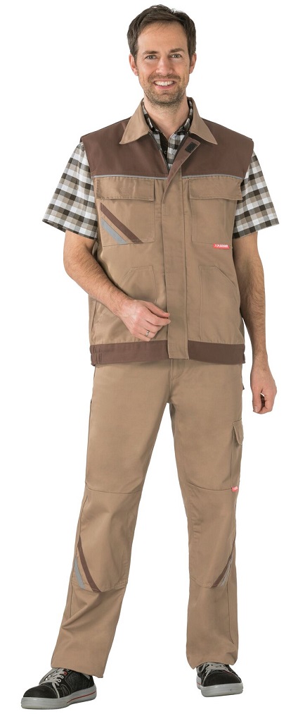2 patch side pockets, 2 breast pockets with flap and Velcro, color applications on the right breast pocket, elastic waistband, concealed front zipper, piping on the saddle, 2 golf pleats in the back.