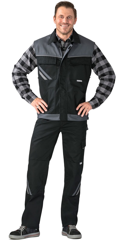 2 patch side pockets, 2 breast pockets with flap and Velcro, color applications on the right breast pocket, elastic waistband, concealed front zipper, piping on the saddle, 2 golf pleats in the back.