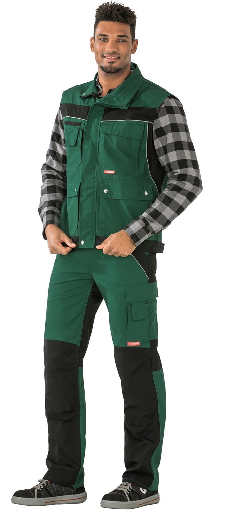 2 patch side pockets with flap and press studs, 1 breast pocket on the left with flap and Velcro fastener, double breast pocket on the right, mobile phone pocket on the right breast, 2 pen pockets, concealed front zip, stand-up collar, adjustable waist with Velcro tape, reflective piping for safety, 2 golf pleats on the back, ventilation slit on the back.
