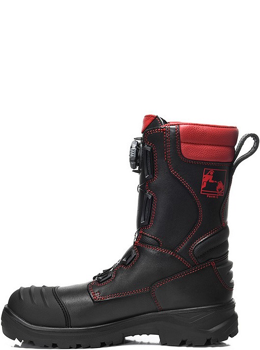TheCOLIN GTX BOA® F2A: The optimal firefighting boot when things have to move fast! With the unique BOA® Fit System, the boot is extremely quick to put on and take off, and it also sits precisely on the foot. Additional comfort is created by the removal aids on the heels, as well as the flexible stretch area on the back of the shaft. The soft ankle pads in the shoe also provide a comfortable feel. The upper material made of fire-resistant cowhide and the seams made of heat-resistantNomex® thread provide the necessary protection against the flames. Additionally, the steel toe cap and steel midsolehelp protect the foot from hazards from all directions. The abrasion-resistant TPU overcap prevents premature wear and ensures a long service life. The eye-catching yellow reflectors, on the other hand, ensure optimum visibility even in poor visibility conditions. The coarse GUMMI/PU sole POWERGRIP in combination with the steep front heel provides a secure g