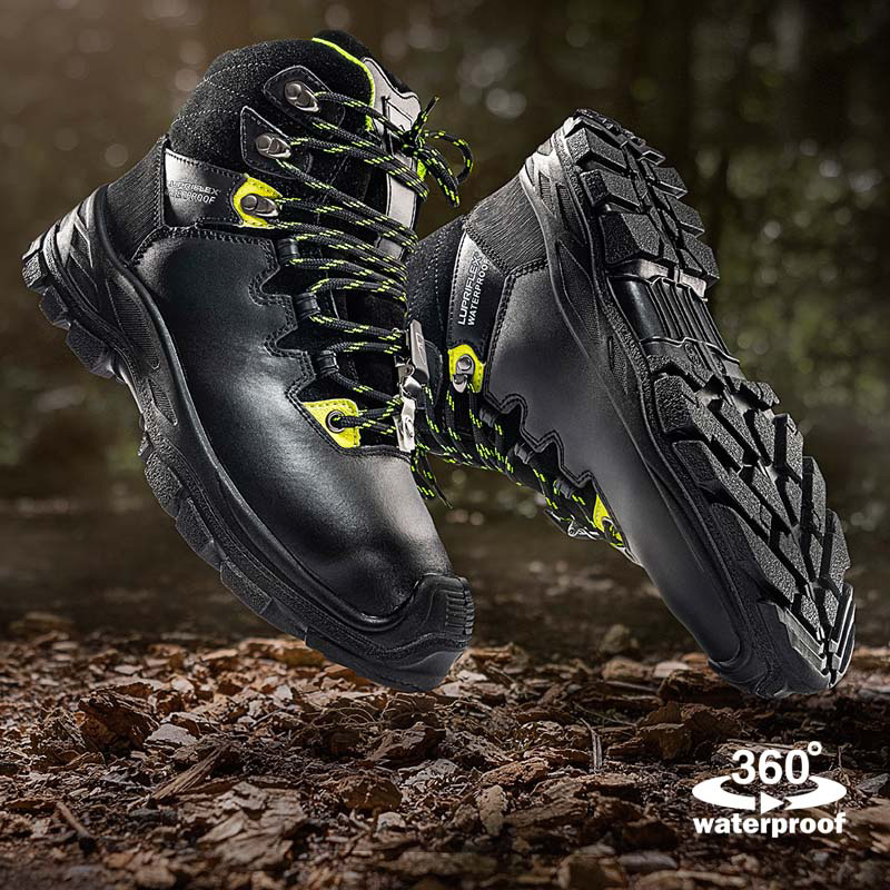 - Waterproof medium height safety shoe with protection against chainsaw cuts