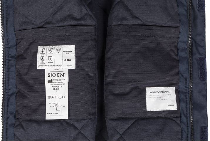 Fabric: Siopor® Excell: 3-layer fabric: dobby ripstop polyester fabric (& AST) + breathable FR PU coating + inherent FR knit; ± 280 g/m².