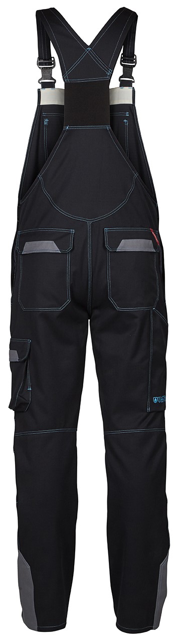 Dungarees with elasticated back and adjustable straps. Outer pocket with flap and Velcro fastener. There is another concealed zipped pocket on the outside pocket. Two slit pockets. Two back pockets with flap and Velcro fastener. Folding rule pocket. Thigh pocket with inner loop with D-ring (front) for attaching an ID card. The thigh pocket is very spacious and ensures unrestricted freedom of movement thanks to the free-hanging bottom. Ergonomically shaped knees. Knee reinforcement/knee pockets, with Velcro fastening at the bottom. Antistatic and flame-retardant. Suitable for industrial laundering.