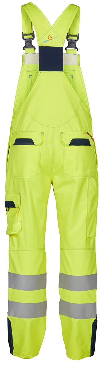 Dungarees with elasticated back and adjustable straps. Outer pocket with flap and Velcro fastener. There is another concealed zipped pocket on the outside pocket. Two slit pockets. Two back pockets with flap and Velcro fastener. Folding rule pocket. Thigh pocket with inner loop with D-ring (front) for attaching an ID card. The thigh pocket is very spacious and ensures unrestricted freedom of movement thanks to the free-hanging bottom. Ergonomically shaped knees. Reinforced knees/knee pockets, with Velcro fastening at the bottom and flame-retardant LOXY® reflective strips. Antistatic and flame-retardant. Suitable for industrial laundering. Clothing class 2.