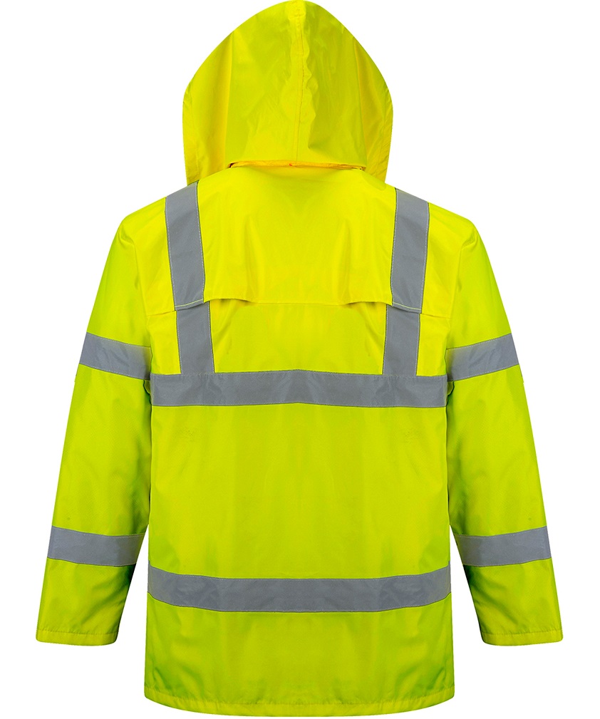 Offers the best visibility and keeps the wearer warm and dry, thus providing the best protection even in bad weather. The H440 is very practical and waterproof. Exceptionally inexpensive and can be combined with the H441 warning rain trousers. Can be easily rolled up and stored until the next use.190T EssentialsThis fabric is made from a 190T, 100% polyester yarn in plain weave, therefore it is durable and robust even in harsh conditions. The fabric is lightweight and offers the best abrasion and tear resistance. The PVC coating on the inside makes the fabric waterprooferdiand the water- and dirt-repellent finish on the outside keeps the garment clean for a long time. Standards: ANSI/ISEA 107-2015 TYPE R CLASS 3 AS/NZS 4602.1:2011 Class D/N EN ISO 20471 Class 3 EN 343 Class 3: Material: outer fabric: 100% polyester 190T, plain weave, PVC-coated 200g lining fabric: only yoke: net fabric 100% polyester, 60g 2 generous pockets Stowable hood for additional functionality Toggle adjustable