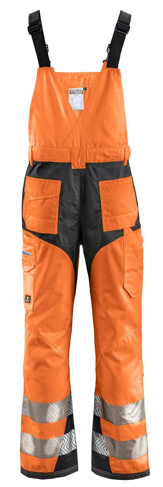 fit thanks to ergonomic cut close to the body in combination with stretch inserts. The resilient Twillfabric is pleasantly soft and supple at the same time. Segmented 7 cm wide reflective stripes, which are printed directly on, around the legs. Dark, stepped reflex fabric on the inner leg, buttocks and pocket openings prevent soiling. Knee pockets for upholstery, as well as pocket bottoms and trouser hems made of abrasion-resistant Oxford fabric. Large cargo pocket on left trouser leg with front mobile phone and pen pocket. 2 front pockets, 2 back pockets, one with and one without pocket flap. Ruler pocket and hammer loop on the right rear leg side. Bib with attached, large flap pocket. Elastic suspenders with adjustable buckles for length adjustment.Standards:PPE Category II (Protection against medium risks)EN ISO 13688 - Protective clothing, general requirementsEN ISO 20471 - High visibility warning clothing, Class 2(minimum visible material area: background material min 0,5 m², re