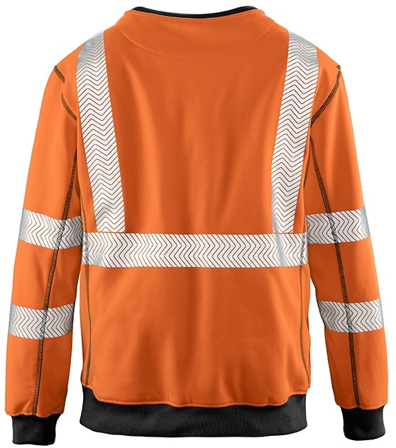 Sweatshirt made of comfortable to wear blended fabric. The cotton fibers lie directly on the skin and thus provide a dry and soft feeling. The robust and colorful exterior is made of recycled polyester. This means that 25 washes are easily possible without any impairment of the warning protection effect. Size M-6XL = warning protection class 3. Size XS+S= warning protection class 2. The segmented reflective stripes are directly printed on, grant a better breathability than sewn on reflective foils and are also elastic together with the outer fabric.