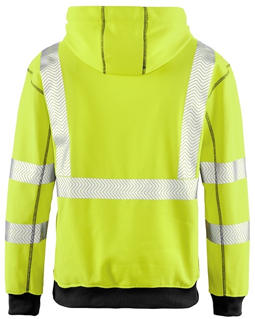 Hoodie made of comfortable to wear blended fabric. The cotton fibers lie directly on the skin and thus provide a dry and soft feeling. The robust and colorful exterior is made of recycled polyester. This means that 25 washes are easily possible without any impairment of the warning protection effect. Size M-6XL = warning protection class 3. Size XS+S= warning protection class 2. The segmented reflective stripes are directly printed on, grant a better breathability than sewn on reflective foils and are also elastic together with the outer fabric.
