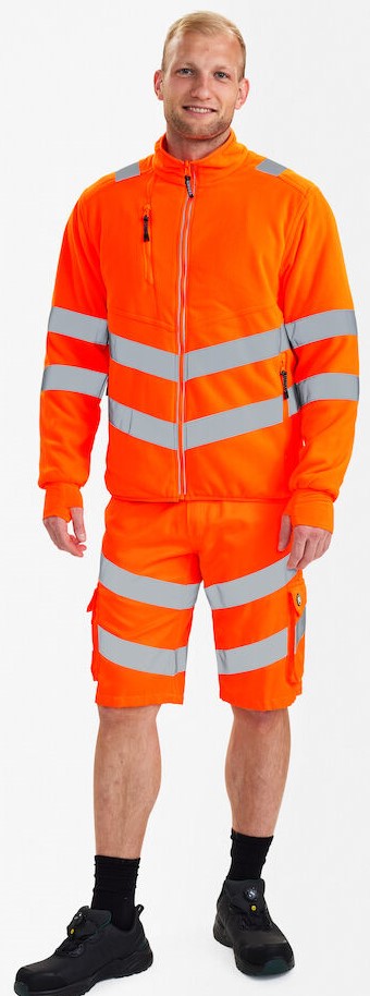 Functional, fluorescent fleece jacket in a modern, attractive design with stretch lining. The jacket is lined with fleece at the collar, making it soft and comfortable against the skin. Reflective zipper at the front. The jacket can be combined with the 1146-930 models, which have a zipper for zipping in. Two spacious side pockets and a chest pocket, each with a zipper. Two large inside pockets with Velcro fasteners. The jacket has an elastic waistband at the bottom. Sleeves with elasticated wind cuffs with thumb opening. Sleeves with elasticated wind cuffs with thumb opening. Additional storm flap made of elastic material in the sleeves. The storm flap with thumb opening can be pulled over the hand to protect against the cold. Reflective stripes across the shoulders and around the sleeves and waist. Clothing class 2, tested after 25 washes.