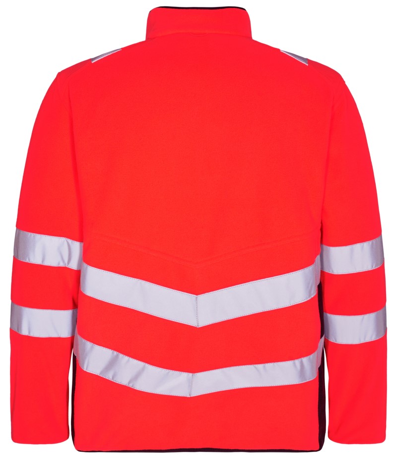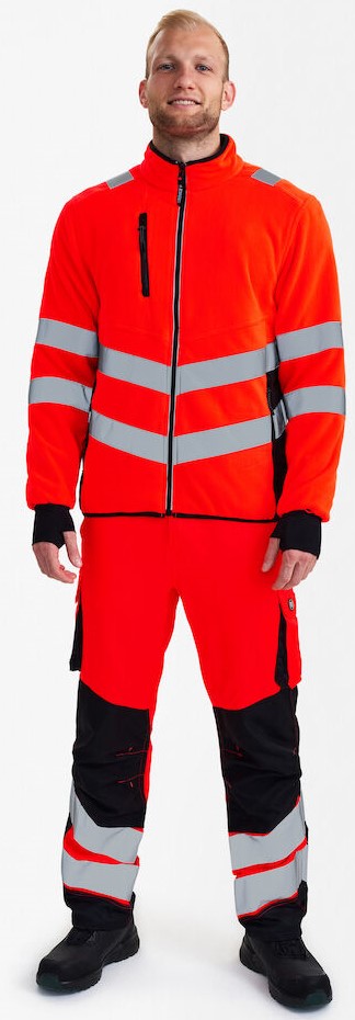Functional, fluorescent fleece jacket in a modern, attractive design with stretch lining. The jacket is lined with fleece at the collar, making it soft and comfortable against the skin. Reflective zipper at the front. The jacket can be combined with the 1146-930 models, which have a zipper for zipping in. Two spacious side pockets and a chest pocket, each with a zipper. Two large inside pockets with Velcro fasteners. The jacket has an elastic waistband at the bottom. Sleeves with elasticated wind cuffs with thumb opening. Sleeves with elasticated wind cuffs with thumb opening. Additional storm flap made of elastic material in the sleeves. The storm flap with thumb opening can be pulled over the hand to protect against the cold. Reflective stripes across the shoulders and around the sleeves and waist. Clothing class 2, tested after 25 washes.