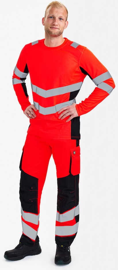 Comfortable and stylish long-sleeved T-shirt with high-visibility function in a modern design. The T-shirt is made from comfortable piqué fabric with cotton on the inside for added comfort. Ribbed neckline. Reflective stripes on the shoulders and around the sleeves and waist. Clothing class 2, tested after 25 washes.