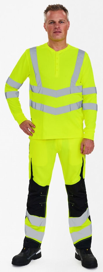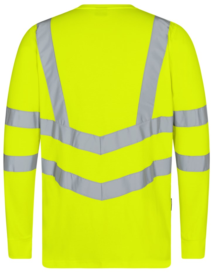 Comfortable and stylish long-sleeved T-shirt with high-visibility function in a modern design. This T-shirt has buttons and a round neckline with a small ribbed cuff. Longer at the back than at the front. Ribbed cuffs on the sleeves. The T-shirt is made from comfortable piqué fabric with cotton on the inside for added comfort. Reflective stripes across the shoulders and around the sleeves and waist. Clothing class 3, tested after 25 washes.