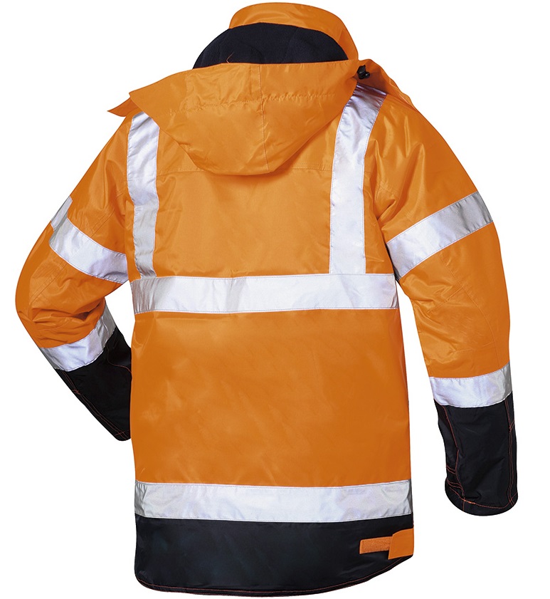 Standard: EN ISO 20471 class 3, (vest separate class 2), EN 343 class 3/1, EN 13688	Upper: 100% polyester oxford, breathable PU coating	Breathability: 3,000 g/m۲/24 h	Water column: 5.000 mm	Lining: 100% polyester	Padding: 100% polyester	Sizes: S-XXXL	Colour: fluorescent orange, navy set off	wind and watererdi, highly breathable	Welded seams	Reflective stripes from 3M™ Scotchlite™ Reflective material	robust Oxford fabric: oil- and dirt-repellent, highly abrasion- and tear-resistant	detachable hood with fleece lining	concealed 2-way YKK® front zipper and press studs/velcro fastener	Inner vest also with YKK® front zipper	sleeves in ergonomic cut for maximum freedom of movement and comfort	warming quilted lining in vest and sleeves	adjustable cuffs and hips (also in waistcoat)	sleeves with inner cuffs	easy emblem application due to zipper in the lining of the vest	Bags, jacket:	2 breast pockets with Velcro closure	1 mobile phone and radio bag	1 inside pocket with zip/velcro fastene