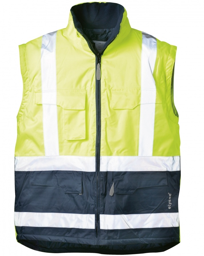 Standard: EN ISO 20471 class 3 (inner jacket separate class 3, vest separate class 2), EN 343 class 3/1, EN ISO 13688	Upper: 100% polyester, Oxford breathable PU coating	Breathability: 3,000 g/m²/24 h	Water column: 5.000 mm	Sizes: XS-XXXXL	Padding: 100% polyester	Lining: 100% polyester	Colour: fluorescent yellow, navy set off	wind and watererdi, highly breathable	Welded seams	Reflective stripes from 3M™ Scotchlite™ Reflective material	robust Oxford fabric: oil- and dirt-repellent, highly abrasion- and tear-resistant	detachable storm hood with fleece lining	concealed 2-way YKK® front zipper and press studs/velcro fastener	Inner jacket can also be worn as a vest	Inner jacket also with YKK® front zipper	sleeves in ergonomic cut for maximum freedom of movement and comfort	unbuttonable rain gutter in the hem	easy emblem application by zipper in the lining of the inner jacket	Bags, outer jacket:	2 breast pockets with Velcro or zip fastener	2 hip pockets with velcro and zipper	1 sleev