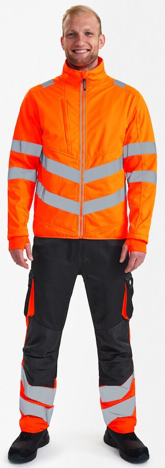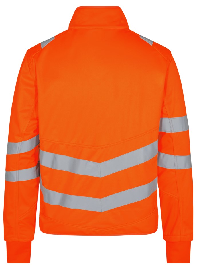 Functional, fluorescent softshell jacket in a modern, attractive design with wind and water-repellent properties. The jacket is lined with fleece on the inside and collar, making it soft and comfortable against the skin. Stretch quality for comfort and freedom of movement. Reflective zipper at the front. Two spacious side pockets and a chest pocket, each with a zipper. Two large inside pockets with Velcro fastening. The jacket has an elastic waistband at the bottom. Sleeves with elasticated wind cuffs with thumb opening. Sleeves with elasticated wind cuffs with thumb opening. Additional storm flap made of elastic material in the sleeves. The storm flap with thumb opening can be pulled over the hand to protect against the cold. Reflective stripes across the shoulders and around the sleeves and waist. Clothing class 2, tested after 25 washes.
