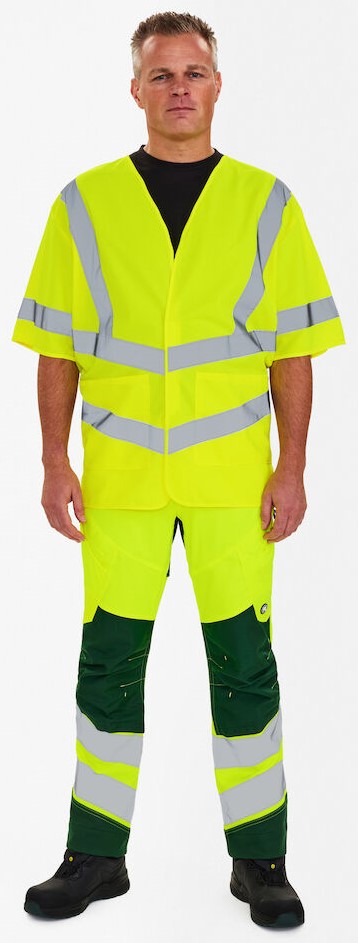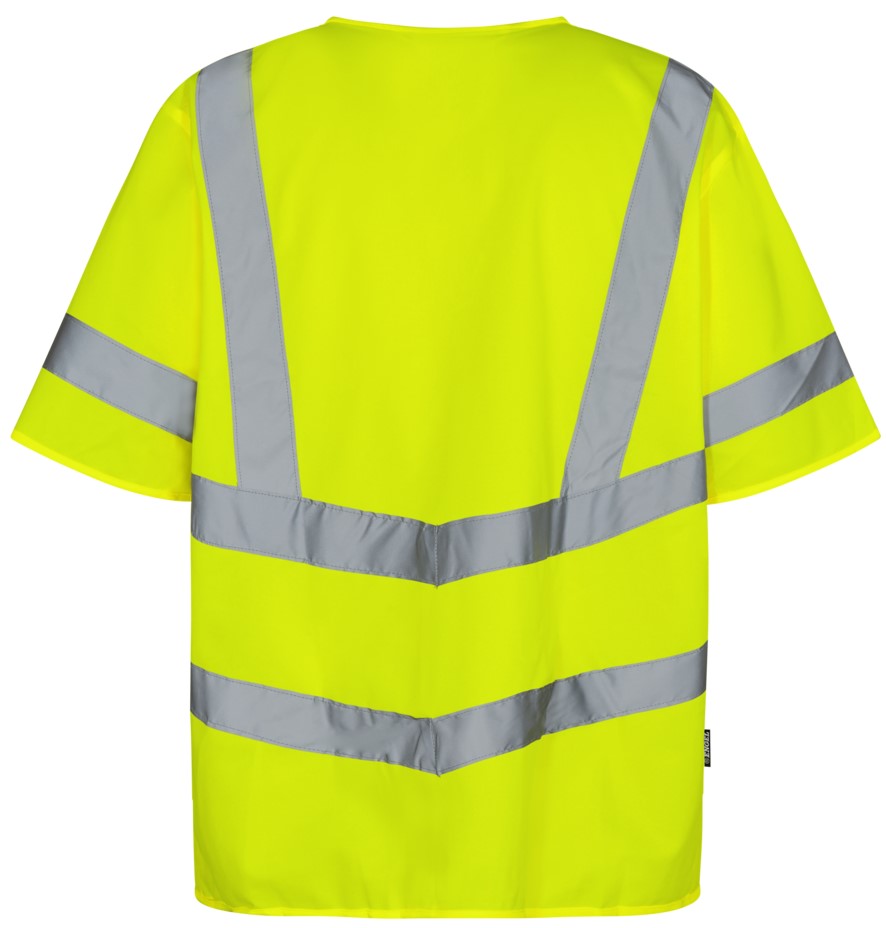 Lightweight, comfortable traffic vest with short sleeves and Velcro fastener at the front. Two large outer pockets with Velcro fastener. Reflective stripes on the torso and over the shoulders. Clothing class 3, tested after 25 washes.