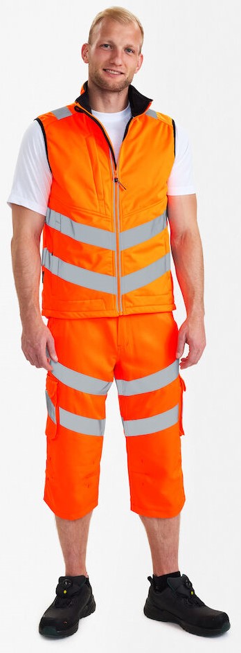 Functional, fluorescent softshell vest in a modern, attractive design with wind and water-repellent properties. The vest is lined with fleece on the inside and collar, making it soft and comfortable against the skin. High-quality stretch fabric for comfort and freedom of movement. Hammer loops on both sides. Reflective zipper at the front. Two spacious side pockets and a chest pocket, each with a zipper. Two large inside pockets with Velcro fastener. The vest has an elasticated cuff at the bottom and armhole. Reflective stripes around the shoulders and waist. Clothing class 1, tested after 25 washes.