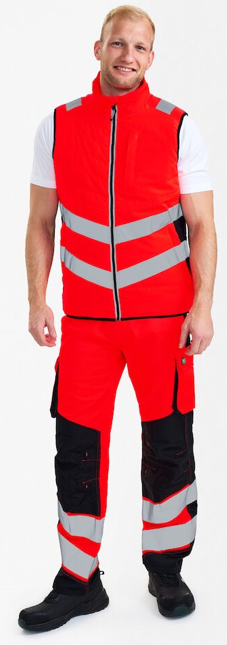 Warm, fluorescent vest in a modern design with wind and water-repellent properties. The vest can be combined with the 1146-930 models, which have a zipper for zipping in. Reflective zipper at the front. Two side pockets and chest pocket with zipper. The vest has an elasticated cuff at the bottom and armhole. Reflective stripes across the shoulders and around the waist. Clothing class 1, tested after 50 washes.