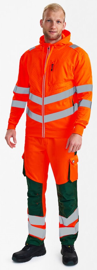 Functional, fluorescent sweat cardigan in a modern, attractive design with stretch lining. Lightly brushed inside, making the fabric soft and comfortable. Reflective zipper at the front. Two spacious side pockets and a chest pocket, each with a zipper. The sweat cardigan has a waffle texture on the front and hood. Ribbed knit at the bottom of the sleeves and hem. Stretchy reflective stripes across the shoulders and around the sleeves and waist. Clothing class 2, tested after 25 washes.