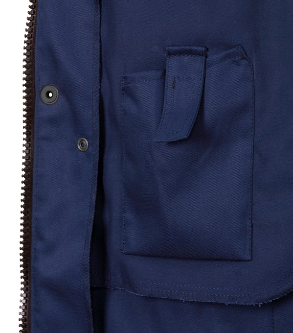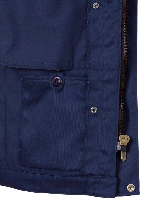 3 breast pockets - 2 with zip, the other extra spacious with flap and press stud fastening, D-ring, ID card holder and pen holder