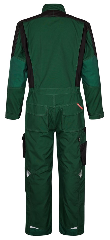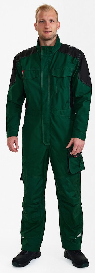 Functional overall with lots of details. Optimum fit, including ergonomically shaped knees, an elastic waist and panel on the inseam in the crotch for more comfort. Concealed zipper at the front. Two chest pockets with flaps - the right one with a loop and D-ring for attaching an ID card, the left one with an additional zipped pocket for a cell phone. Adjustable cuffs. Two spacious, slanted slit pockets at the front. Two spacious back pockets with flap and Velcro fastener. Thigh pocket with zipper pocket and additional small pocket. It is spacious and provides more freedom of movement thanks to the free-hanging bottom. Reinforced ruler pocket at the bottom with additional compartments. The ruler pocket also has a free-hanging bottom. Knee reinforcement/knee pocket with Velcro fastener at the bottom and two adjustment options for knee pads. Reinforced hem at the back and front of the trouser legs and reinforced elbows for extra wear resistance. Reflective strips on shoulders, waist and