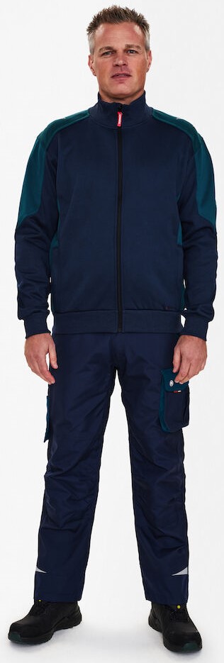 Functional and comfortable jersey cardigan with bonded fleece inside. Front zipper. Two large slit pockets with zipper. Ribbed collar and knitted cuffs and waistband. High visibility thanks to reflective appliqués on the shoulders.
