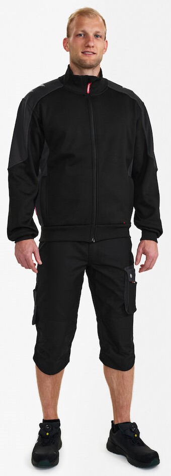 Functional and comfortable jersey cardigan with bonded fleece inside. Front zipper. Two large slit pockets with zipper. Ribbed collar and knitted cuffs and waistband. High visibility thanks to reflective appliqués on the shoulders.