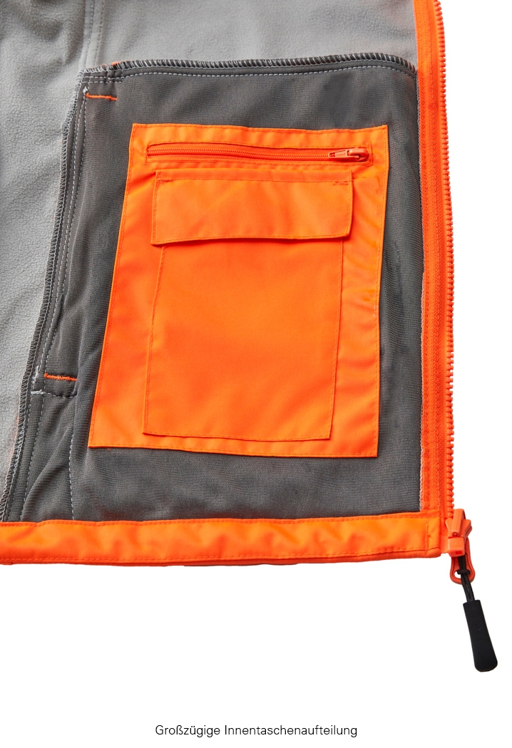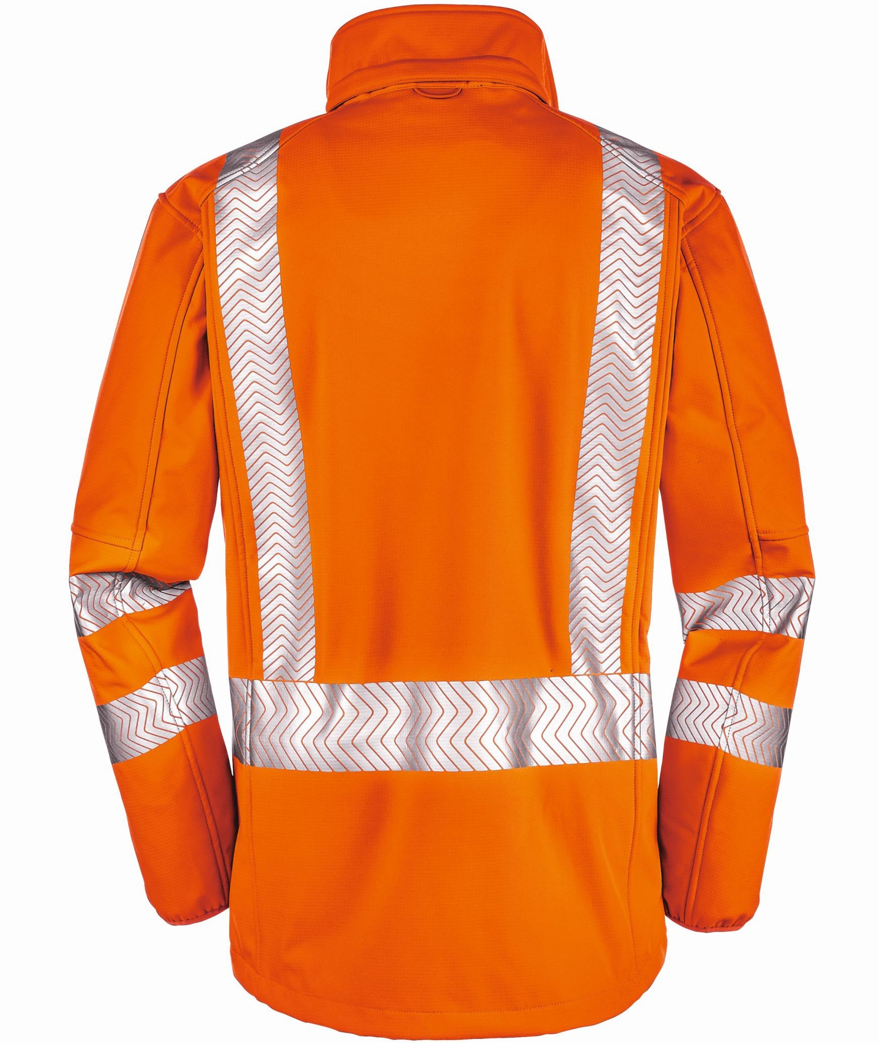 Same safety for all sizes. Even the smallest size (XS) of the TYLER softshell jacket achieves the highest safety class 3 for high-visibility protective clothing. The segmented laminated reflective strips run around the body and sleeves as well as over the shoulders (suspenders reflective strips).Theinnovative functional membrane guaranteesthat the fabric ishighly waterproof and breathable. The combination of elastic fabric with a close-fitting cut and ergonomically shaped sleeves ensures an extremely high level of comfort. The ripstop fabric is robust, hard-wearing and therefore particularly durable. The high-quality overall package is rounded off by an elaborate interior finish with numerous storage options. It can be printed in accordance with the manufacturer's format specifications, without any negative impact on the high-visibility classification. A major advantage if personalization is desired.