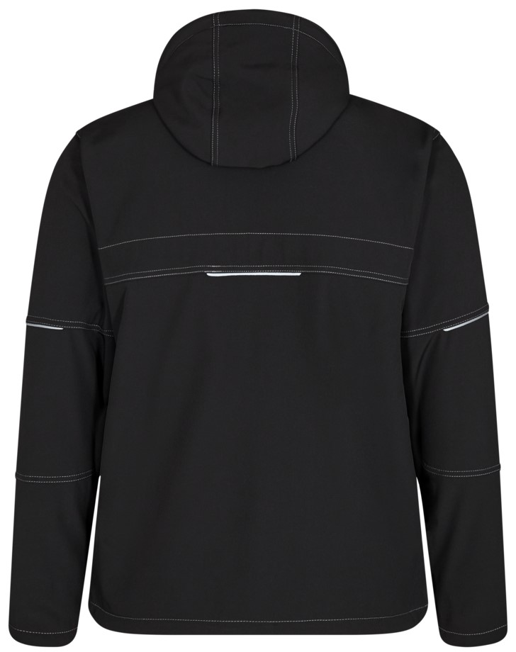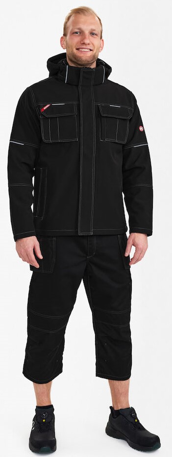 Single-colored pilot jacket with contrasting topstitching. Reflective piping. Concealed zipper and press studs at the front. Nylon quilted lining and soft fleece in collar. Two side pockets. Two breast pockets with flap and concealed press studs. The right pocket has an extra pocket with a compartment for tools and a loop with a D-ring. Piped pocket with zipper, cell phone pocket with flap and Velcro fastener, two compartments for pens and tool loop. One concealed Napoleon pocket with zipper on the left chest. One spacious inner pocket with zipper. A small inner pocket and another pocket for a cell phone, both with flap and Velcro fastening. Zipper in the lining (option for print). Cord stopper at the bottom of the jacket hem. Adjustable cuffs with Velcro fastening and wind protection. Detachable hood with zipper, cord stopper and adjustable Velcro fastener.
