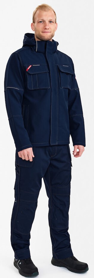 Single-colored pilot jacket with contrasting topstitching. Reflective piping. Concealed zipper and press studs at the front. Nylon quilted lining and soft fleece in collar. Two side pockets. Two breast pockets with flap and concealed press studs. The right pocket has an extra pocket with a compartment for tools and a loop with a D-ring. Piped pocket with zipper, cell phone pocket with flap and Velcro fastener, two compartments for pens and tool loop. One concealed Napoleon pocket with zipper on the left chest. One spacious inner pocket with zipper. A small inner pocket and another pocket for a cell phone, both with flap and Velcro fastening. Zipper in the lining (option for print). Cord stopper at the bottom of the jacket hem. Adjustable cuffs with Velcro fastening and wind protection. Detachable hood with zipper, cord stopper and adjustable Velcro fastener. Features: Material:100% polyester, 300 g/m² OEKO-TEX STANDARD 100 soft fleece fabric in the collar concealed zipper with press
