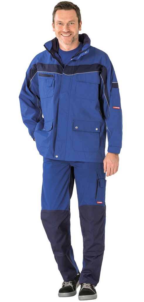 Breathable, waterprooferdi, glued seams, fleece collar, reflective piping as safety feature, hood in collar, 1 breast pocket on left with flap and Velcro fastener, double breast pocket on right, mobile phone pocket on right breast, 2 pen pockets, 2 side pockets, 2 patch side pockets, sleeve pocket on left, document pocket under front flap, mesh lining inside, concealed front zip, adjustable cuffs with Velcro fastener.