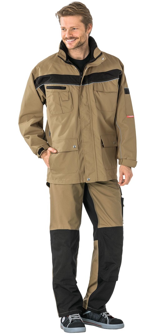 Breathable, waterprooferdi, glued seams, fleece collar, reflective piping as safety feature, hood in collar, 1 breast pocket on left with flap and Velcro fastener, double breast pocket on right, mobile phone pocket on right breast, 2 pen pockets, 2 side pockets, 2 patch side pockets, sleeve pocket on left, document pocket under front flap, mesh lining inside, concealed front zip, adjustable cuffs with Velcro fastener.