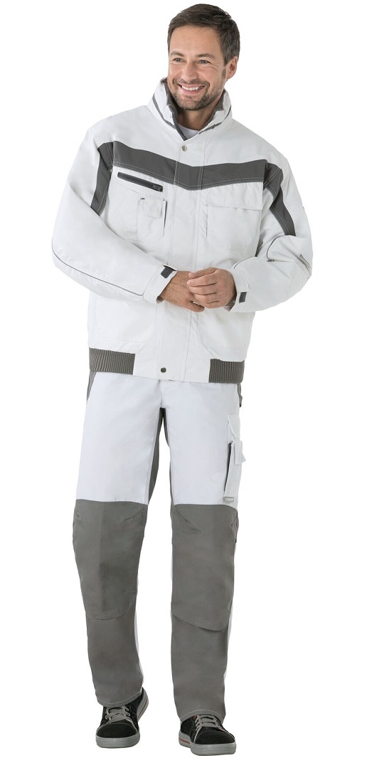 Breathable, waterprooferdi, glued seams, fleece collar, reflective piping as safety feature, hood in collar, 1 breast pocket left with flap and Velcro fastener, double breast pocket right, mobile phone pocket on right breast, 2 pen pockets, 2 side pockets, 2 patch side pockets, sleeve pocket on the left, document pocket under the front flap, quilted lining, concealed front zip, knitted cuffs on hem, elastic sleeve cuffs adjustable with Velcro.