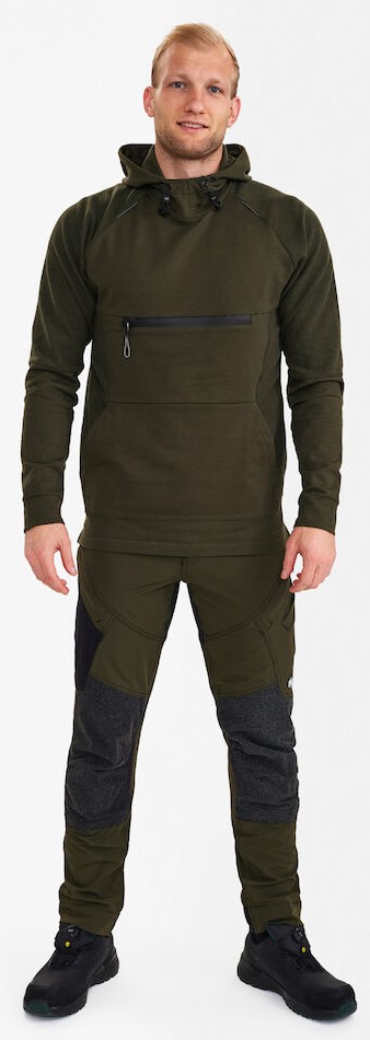 Comfortable hoodie made from lightweight and stretchy material. The hoodie has a brushed inside for increased comfort. Practical kangaroo pocket on the front with a water-repellent zipper. Extended back section. Hood with drawstring. Pre-washed material ensures that the item retains its shape. The hoodie has reflective piping on the front shoulders for better visibility.