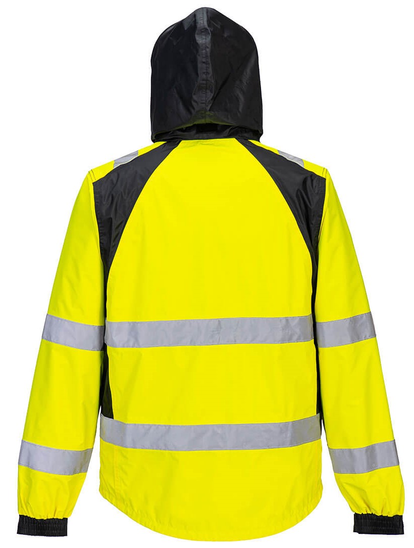 Designed to keep the wearer visible, safe and dry in inclement weather. This lightweight, stylish, two-tone jacket features a detachable hood for easy access, large pockets for plenty of storage and a double storm flap for protection from the elements.
