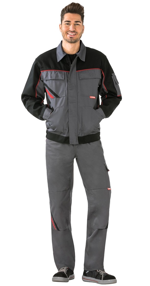 2 patch side pockets, 2 breast pockets with flap and Velcro closure, coloured applications on the right breast pocket, mobile phone pocket on the left sleeve, adjustable cuffs with Velcro closure, concealed front zip, elastic waistband, piping on saddle and sleeves, 2 golf pleats on the back.