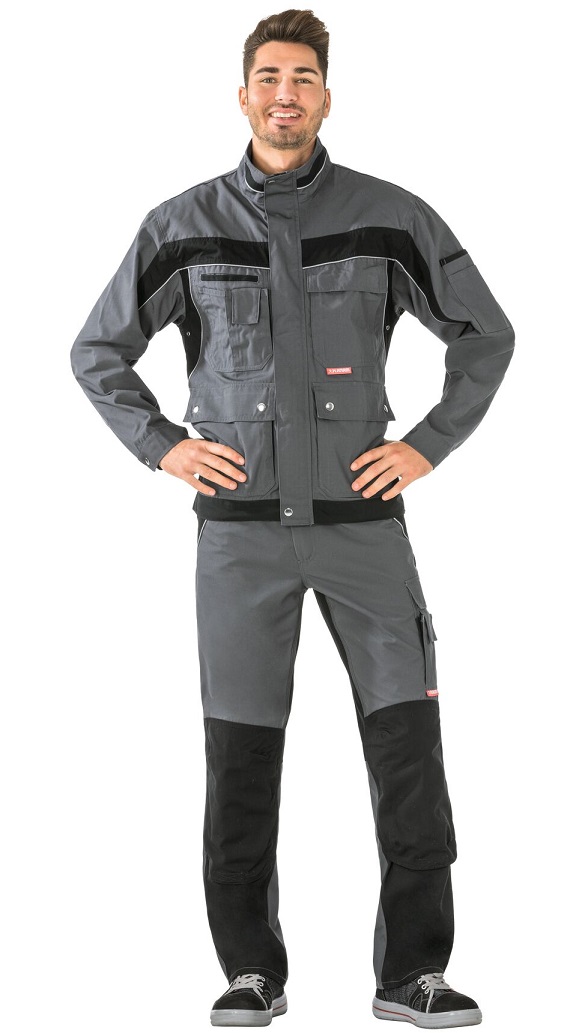 2 patch side pockets with flap and press studs, 1 breast pocket left with flap and Velcro fastener, double breast pocket right, mobile phone pocket on the right breast, 2 pen pockets, adjustable cuffs with press stud, concealed front zip, stand-up collar, adjustable waistband with Velcro tape, sleeve pocket left, reflective piping as safety equipment, 2 golf pleats in the back, ventilation slit in the back.