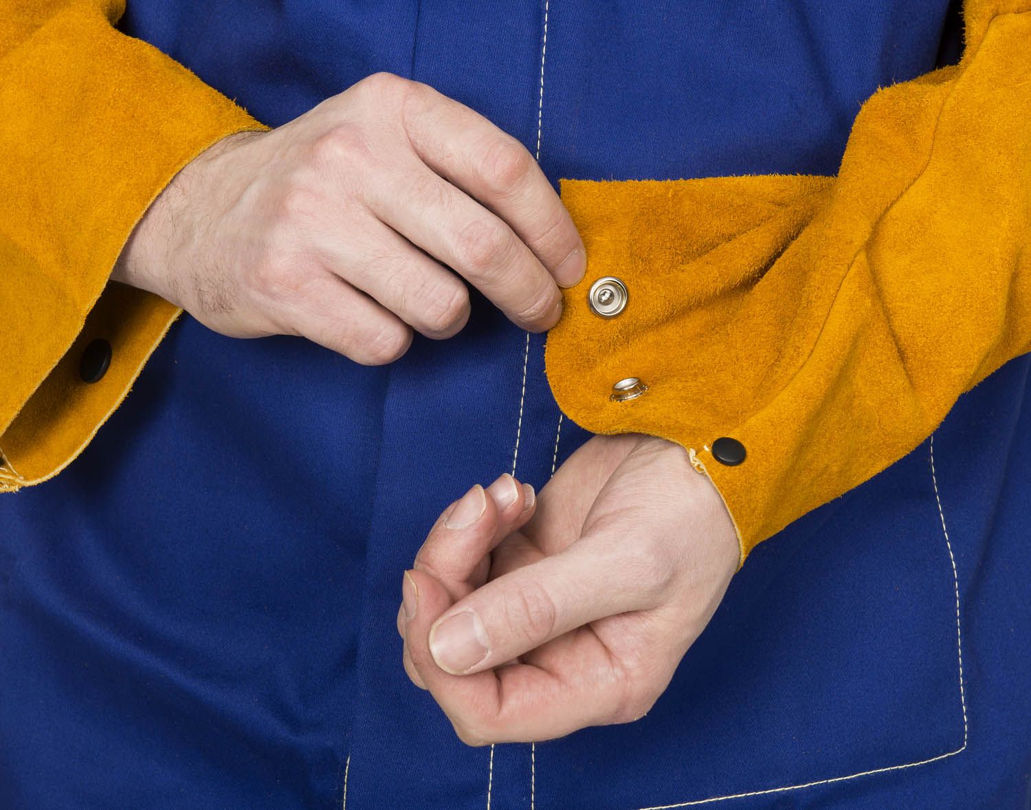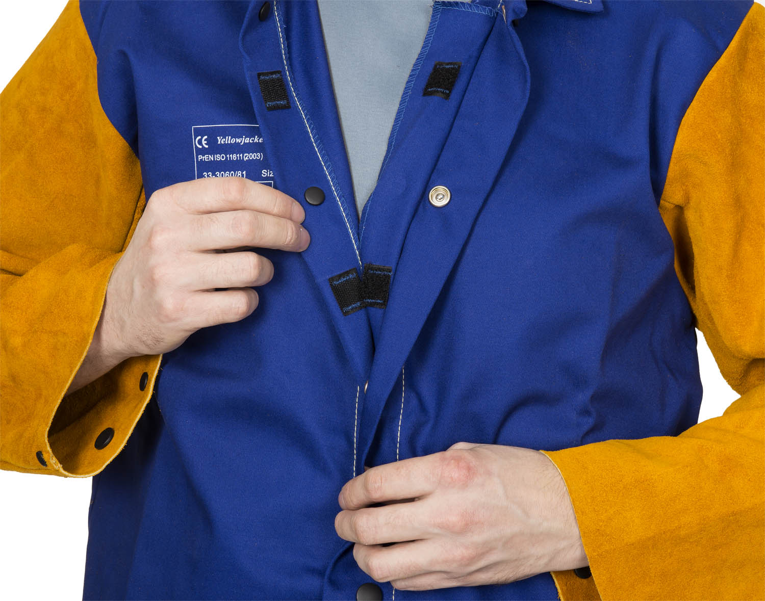 Yellowjacket® long blue flame resistant cotton jacket with yellow cow split leather sleeves.