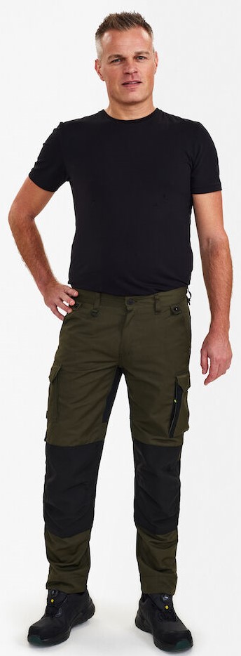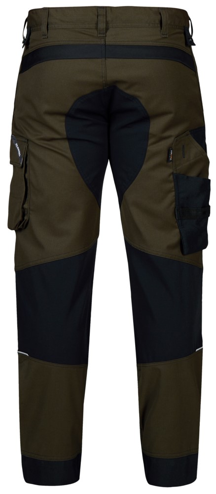 Functional craftsman trousers with stretch and slim fit and many practical details. Ergonomically shaped knees. Inserts made of extremely elastic, breathable stretch material in the back of the knees for even more comfort. D-ring at the front, e.g. for an ID card. Two spacious, slanted slit pockets at the front. Two back pockets with flap. Cell phone pocket with flap on the right thigh. Left thigh pocket with flap. The thigh pocket has an additional zippered compartment. Reinforced folding rule pocket with additional compartments and tool loops. Thigh pocket and ruler pocket with free-hanging bottom ensure optimum freedom of movement. Knee reinforcement/knee pocket with Velcro fastener at the top for height-adjustable knee pads (two adjustment options). Reinforced hem on trouser legs for extra wear resistance. High visibility thanks to reflective piping in the middle of the back of the trouser legs. Extra wide turn-up allows the crotch length to be extended if required. To extend the c