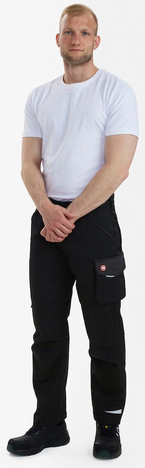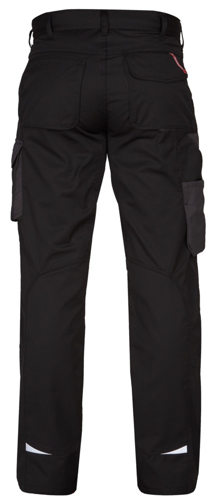 Functional work trousers with many details. Optimum fit, including ergonomically shaped knees and a panel on the inseam in the crotch for greater comfort. Two spacious, slanted slit pockets at the front. Loop with D-ring (front) for attaching an ID card. Two spacious back pockets, the right one with flap and Velcro fastener. Thigh pocket with zipper pocket for cell phone, additional small pocket. Folding rule pocket with additional compartments. The ruler pocket has a free-hanging bottom. Reflective strips at the bottom of the trouser legs for increased visibility. Suitable for industrial laundering.