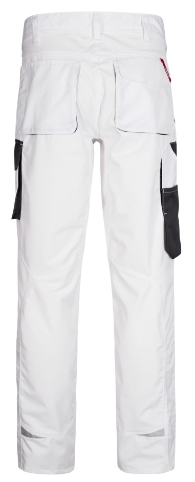 Functional work trousers with many details. Optimum fit, including ergonomically shaped knees and a panel on the inseam in the crotch for greater comfort. Two spacious, slanted slit pockets at the front. Loop with D-ring (front) for attaching an ID card. Two spacious back pockets, the right one with flap and Velcro fastener. Thigh pocket with zipper pocket for cell phone, additional small pocket. Folding rule pocket with additional compartments. The ruler pocket has a free-hanging bottom. Reflective strips at the bottom of the trouser legs for increased visibility. Suitable for industrial laundering.