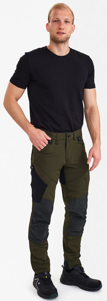 Functional craftsman trousers with a modern fit and many practical details. Optimum fit with e.g. ergonomically shaped knee area. The fabric with comfortable 4-way stretch offers first-class durability and breathability. The fabric has excellent moisture-absorbing properties, dries quickly and is therefore particularly comfortable. Buttons for easy attachment of holster pockets. D-ring at the front for attaching ID cards, for example. Two spacious slanted front pockets. Two back pockets. Two thigh pockets with zipper. The left thigh pocket has an additional cell phone pocket. The right thigh pocket has a patch ruler pocket with additional dividers. Knee reinforcement/knee pocket with Velcro fastening at the bottom and two height adjustment options for the knee pad. The knee reinforcement is made of particularly hard-wearing Kevlar material. The trouser leg cuffs are reinforced at the back for extra durability. Wide bottom hem that can be left out if extra leg length is required. To len