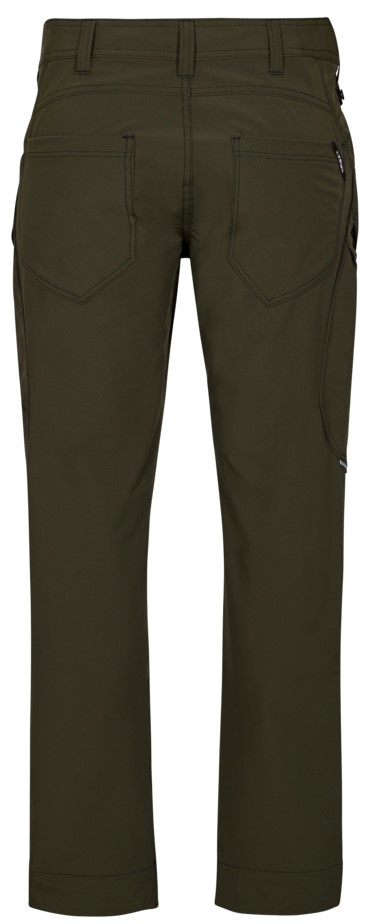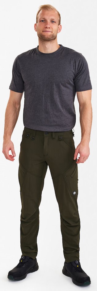 Functional service trousers with many functional details. The fabric is equipped with comfortable 4-way stretch for a better fit and more freedom of movement and with cotton on the inside for maximum comfort. The trousers have an ergonomically shaped knee area. Two spacious slanted front pockets. Two back pockets. Two thigh pockets with zippers. The left thigh pocket has an additional cell phone pocket. The right thigh pocket has pleats for extra width and an inside pocket. D-ring at the front for attaching ID cards, for example. Wide bottom hem that can be left out if extra leg length is required. Only one seam needs to be undone to lengthen the trousers. The trouser leg is still hemmed.